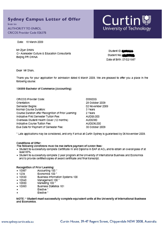 善子俊同学是我项目2008级学生,经过他在对外经贸大学信息学院出国留学预科班一年的学习提升,收获了澳洲科廷科技大学的OFFER。